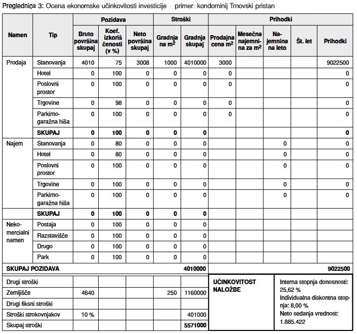 Notranji razvoj mest se v sodobni urbanistični praksi kaže kot ena najbolj vzdržnih oblik razvoja mest, ki ima številne prednosti pred širjenjem mest na nova zemljišča. Poleg vseh prednosti pa odpira tudi dileme, kako novogradnje umeščati v že izoblikovano urbano okolje, da ne bi sprožili estetske ali funkcionalne degradacije in hkrati ne bi bila kratena legitimna pričakovanja investitorjev o donosnosti naložbe. Članek obravnava metodologijo za oceno in spodbujanje urbanističnooblikovalskih kvalitet in ekonomske učinkovitosti projektov za razvoj/prenovo mestnih lokacij. Uporabnost te metode je prikazana na analizi ljubljanskih primerov nadomestne oziroma dopolnilne gradnje (večstanovanjski objekt na Gradaški ulici in kondominij v Trnovskem pristanu), ki sta s svojo nekonvencionalnostjo vzbudila pozornost širše javnosti, z vidika urbanističnooblikovalskih meril pa v marsičem zanikata zdajšnji značaj prostora.